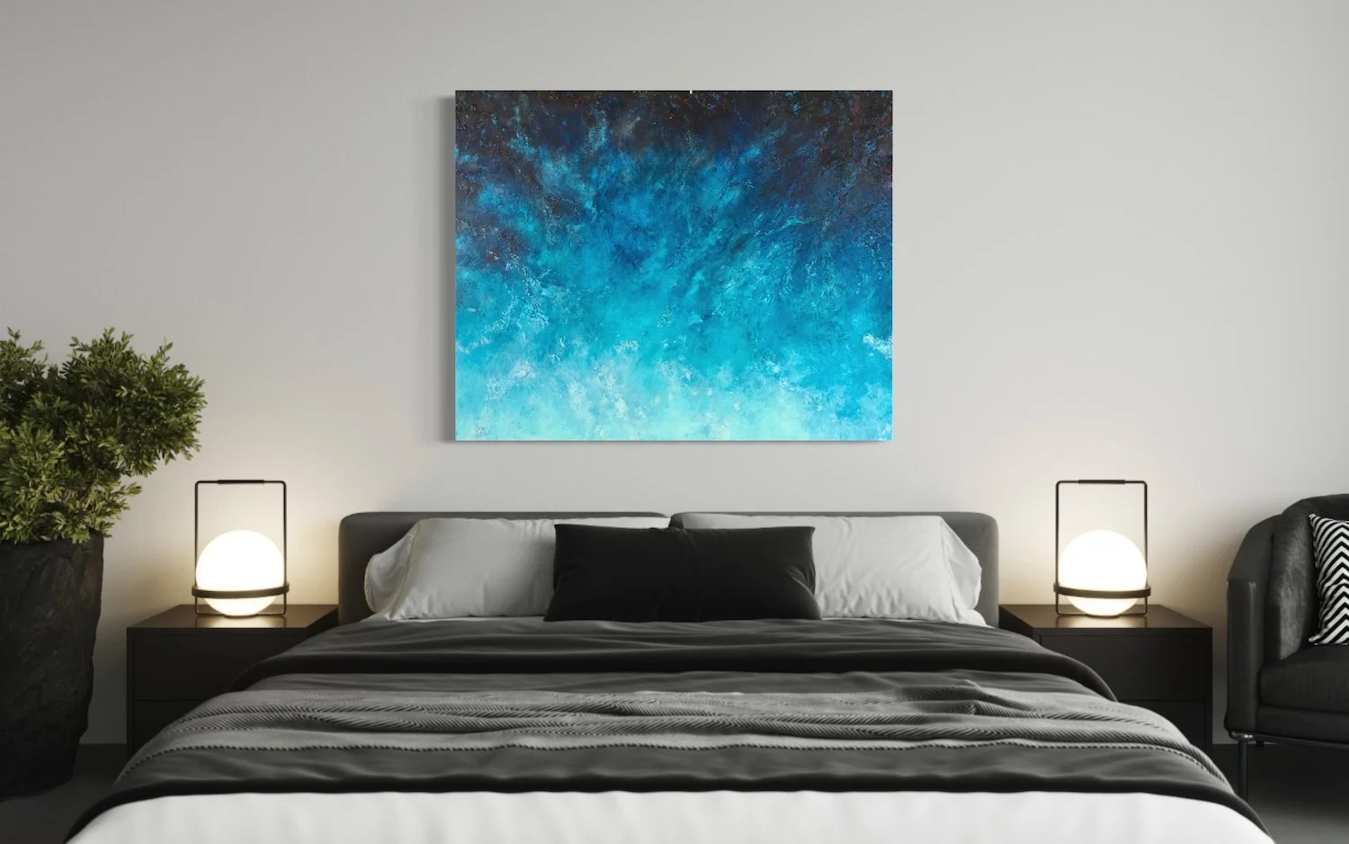 I found refuge in my Studio and almost revelled in not being able to go out. Painting made me feel peaceful. There is a lot of light and, upon closer inspection, you can see colour in the darker sections. I felt like I was painting my happy place underwater. My husband thought it was a view from outer space looking down on the World.